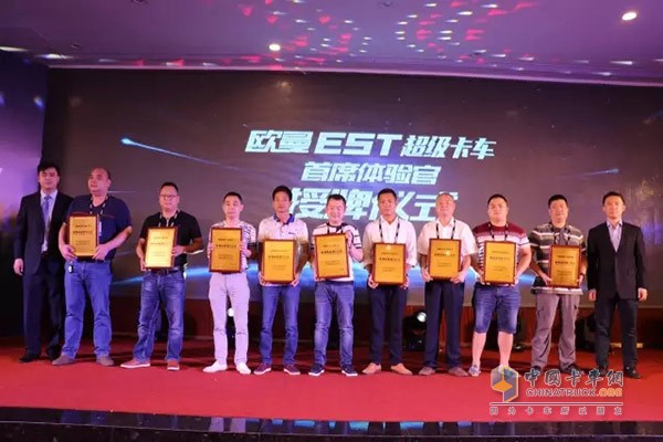 福田戴姆勒汽車品牌總監(jiān)李健、福田戴姆勒汽車營銷公司副總經(jīng)理劉剛為歐曼EST超級卡車“首席體驗官”授牌
