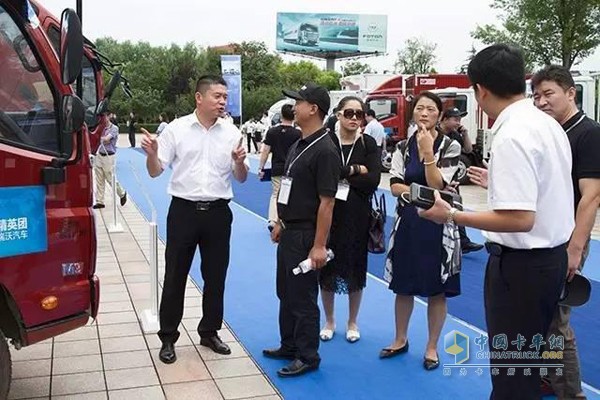 講解員為現(xiàn)場嘉賓講解福田時代M3、瑞沃ES超級卡車