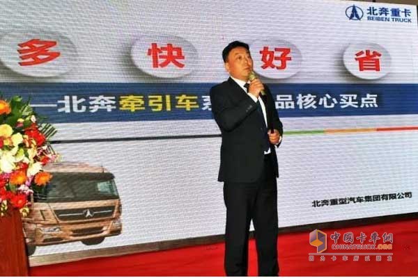 產品推介會環節,張寶勝詳細講解了北奔重汽的軍工文化、技術來源和產品優勢。北奔重汽以先進獨特的奔馳技術為核心,深度融合嚴謹領先的軍工技術,通過消化吸收,自主創新,以車輛化、模塊化戰略,構建起系列化的重卡產品平臺。張寶勝講到北奔重卡“多快好省”優勢集中體現在:北奔重卡拉的多、跑的快、質量好、用著省。輕量化設計、強承載力讓北奔牽引車拉的更多;動傳模塊一體化設計、后續儲備功率大、良好的制動效果讓北奔牽引車無論是平路行駛、上坡路段還是下坡行駛,均能保持車輛高速行駛;同時,高安全性、高舒適性、強可靠性讓北奔牽引車的質量標準得到極大提升;更好的節油效果、超長的保修期讓北奔牽引車無論怎么用都可以省油、省錢、省時間。