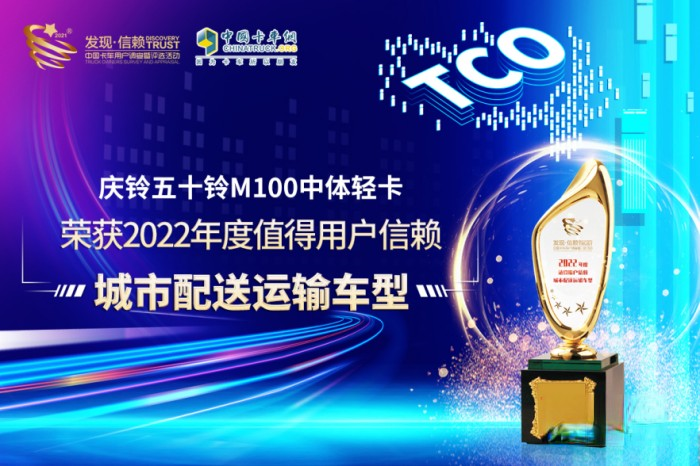 2022年2月22日,第七屆發現信賴中國卡車用戶調查暨評選活動頒獎盛典舉辦,慶鈴五十鈴M100中體輕卡再次閃耀在鎂光燈下,摘得“2022年度值得用戶信賴城市配送運輸車型”獎。