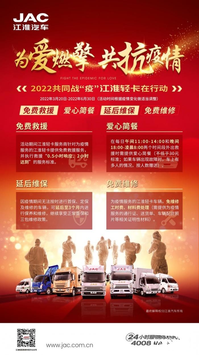 這次春季疫情反撲,全國(guó)各地都出現(xiàn)較多新增病例,鑒于此江淮輕卡迅速響應(yīng),繼續(xù)開(kāi)展為愛(ài)燃擎共抗疫情系列大型援助行動(dòng),針對(duì)高風(fēng)險(xiǎn)地區(qū),江淮輕卡免費(fèi)救援、免費(fèi)愛(ài)心簡(jiǎn)餐、免費(fèi)維修等服務(wù)將持續(xù)開(kāi)展,另外疫情期間需要保養(yǎng)的用戶(hù),可申請(qǐng)延后維保,保障卡友權(quán)益不受任何損失。