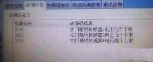 故障分析:根據(jù)診斷儀檢測的故障碼,使用專用萬用表檢測油門線電壓,診斷儀給出的三個故障碼都是油門踏板傳感器電壓問題,初步判斷是機(jī)油壓力傳感器的內(nèi)部短路導(dǎo)致的油門踏板電壓不對,拔掉機(jī)油壓力傳感器后測量,電壓穩(wěn)定,更換機(jī)油壓力傳感器后加油正常,故障排除。